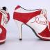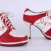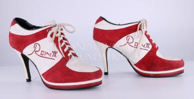 Pair of women's high stiletto heel sneakers in silver leather and red suede with white cotton laces. The name of the brand "Reina" is written in red rhinestones on each side of the shoe.