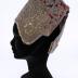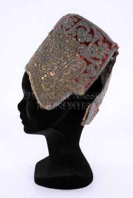 Kokoshnik headdress lined with a floral print silk on hard interfacing base cover with a red velvet fabric entirely embroidered with golden sequins, rhinestones and grey and gold threads representing stylized foliage.