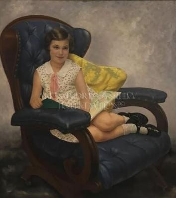 Portrait of a girl in a dark blue leather armchair with a book.