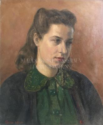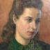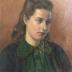 Painting portrait of a young woman wearing a green shirt with round collar, embroidered with light green traceries and clovers, and a blue vest with red rims and buttons. She is styled with semi-tied brown hair. The model is painted looking outside the frame on her left, and in front of a brown hanging.