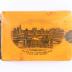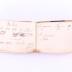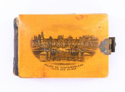 Olive wooden notepad with copper clasp, leather binding, and all edge gilt. Printed on the cover is an illustration engraving of Palais de Fontainebleu. Contains paper pages inside. The owner of the book wrote riddles on some of the pages and made calculations.