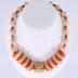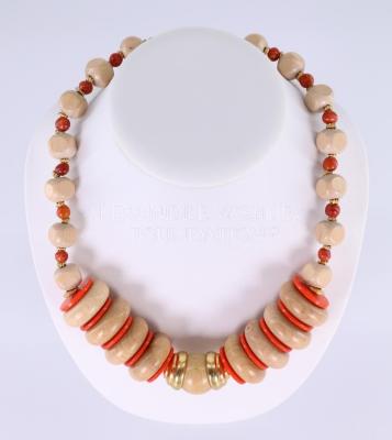 African tribal-inspired medium short necklace that came out of the Black is Beautiful movement. The centerpiece is a light wood sphere enclosed by two, three-tear gold-colored beads. Four oak-colored wooden spheroids alternate with flat, bright orange circular beads on either side of the heart. The rest of the chain is in a pattern of gold flower spacer beads, small dark orange wood spherical beads, and beige wood rounded cube beads. The beads are threaded onto a clear plastic string with a brass hook and eye clasp.