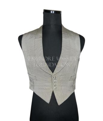 Man’s waistcoat in grey striped silk satin at the front and grey at the back, with shawl collar, pointed bottom edges, and two side pockets. The garment closes at the front with four small round buttons.