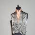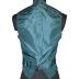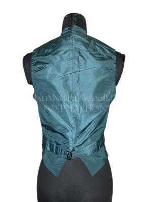 Man’s waistcoat in grey striped silk satin at the front and green at the back, with shawl collar, trimmed with soutache, pointed bottom edges, and two side pockets. The garment closes at the front with three small round buttons.