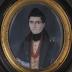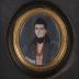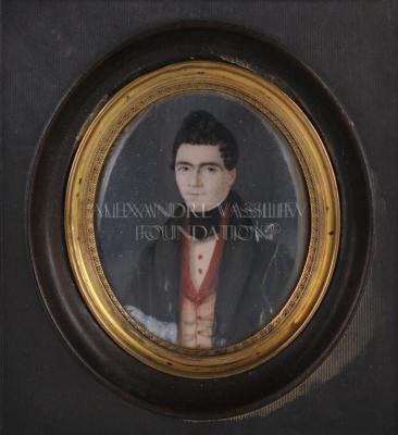 Miniature painting portrait of a man wearing a white shirt with two visible red buttons, a cream vest with a red collar, a blue overcoat with a partically black collar, and a black bowtie tied directly underneath his chin. His black hair is piled ontop of his head in a cone shape. He is painted ontop of a grey background and is framed by a golden oval brass frame placed inside a rectangular black wooden frame.