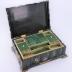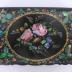 Squared-wavy shaped toilet necessaire with a mother of pearl marquetry on black pear wood. The lid is decorated by a single round panel with golden frame and flowers such as roses or blue forget-me-nots in it, reminding the surrounding patterns. The sides are representing floral forms as well, with golden arabesques. The inside of the box is equipped with twelve green compartments of various sizes with geometric decorations, sometimes crowned with a dark green velvet lid, two with handles and one with a ribbon.