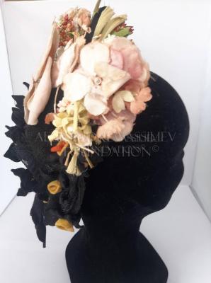 Summer evening bonnet embellished with artificial flowers and tulle.