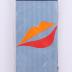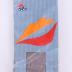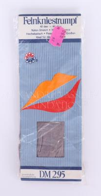 Silver grey woman's knee socks, packed in blue striped cardboard with orange and red lip print, and plastic pouch. The envelope indicates the thickness, the material, the price and specifications about the product in dark blue inscriptions on white background.