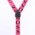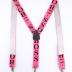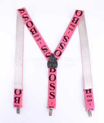 Pair of braces consisting of two pink elastic ribbons on the front, creating a V in the back with a central elastic band, reinforced with a black leather triangle patch on the top with rounded edges. The straps have a repetitive motif of printed in black phrase "I am the BOSS", and are adjustable with silver metal mecanisms on the front, and secured with clip closures on the bottom.
