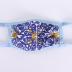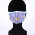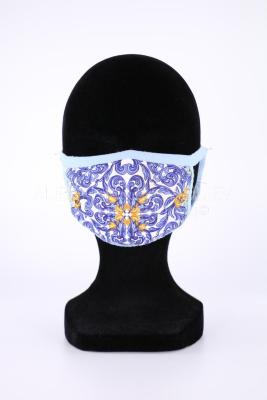 Face mask, made of polyester level on the front, with a blue and yellow stylized vegetal print on white background inspired by potugese azulejos, and lined with white cotton on the inside. Trimmed with blue cotton all over, creating two hoops for earrings.
