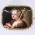Rectangular brass mounted brooch adorned with a handpainted on porcelain miniature representing a young child with blond curly hair in a brown fur coat, praying and holding a long golden cross. The frame has fine engraved motifs, and the brooch has a pin on the back with a C-fastening.