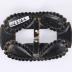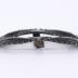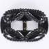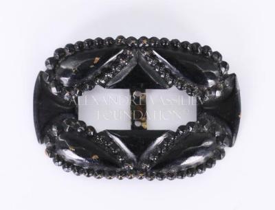Rectangular shoe buckle with rounded edges and openwork center, made of brass, covered in black, with front repoussé ornament representing two tears on the top and bottom surrounded with dotted contours.