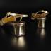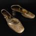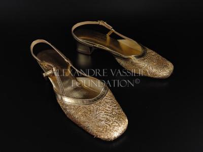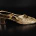 Pair of women's slingback shoes made of gold tone brocade with metallic thread embroidery and gold tone leather.