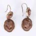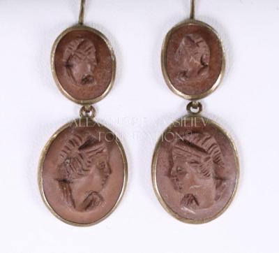 Pair of earrings, each has two oval volcanic lava cameos, the one above smaller than the one below, with a female and male profile looking at each other, mounted in brass with hook fastening. This pair of earrings could have been brought back from Pompeii, as a souvenir of the Grand Tour.