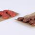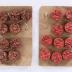 Two sets of 10 for one and 9 for the other unmounted ceramic buttons and their carboard packaging. The set with 10 buttons is painted in red, and the other in brown. Each button has a high relief pattern of three birds, one flying and two perched, accompanied by plants.
