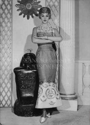 Paper photograph illustrating a fashion model wearing Carven fashion house creation "Nefertiti" for spring-summer 1960 collection, consisting of an evening pencil dress in orange shantung and a matching headdress. The top and bottom are decorated with gold and white embroideries, inspired by Egyptian motifs. The headgown is covered with sequins and is made of two stylized scarab wings closing on the forehead, and two circles covering the ears. The look is completed with a pair of shoes with a small rose on the front. The lady is standing with her arms pleated horizontally in front of her, on the background of an Ancient Egypt statue.