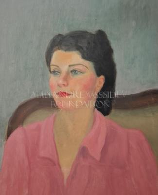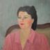 Portrait in oil on paper representing a young woman represented in three quarters and seated at the end of a sofa. She is wearing a pink blouse, slightly open revealing a textile piece that hides her neckline. Her black hair is lightly permed in the front and gathered in the back, falling at the nape of her neck. The lady is lightly made up, her cheekbones are raised in pink and her lips drawn with lipstick, to complete the whole her eyebrows are finely drawn and made up.