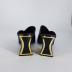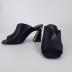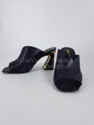 Soft black leather mules of cross over design with slanted heel decorated with gold metal.