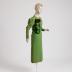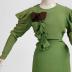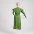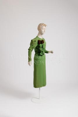 Green cocktail dress with a jewel neckline, long cowl sleeves, four covered buttons closure on the right shoulder and sewn-in belt with rear buckle. The right front of the dress is embellished with one chocolate colour and three matching colour bows.
