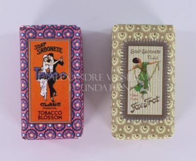 Two bars of soap in colorful packaging. One is named "Fox-Trot", named after a popular ball-room dance of the early 20th century on a background of different shades of green. The second is named "Tango" on patterns of pink and blue and with an image of a couple dancing tango.