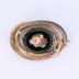 Small oval brooch, with glass micromosaic representing a composition of colorful flowers, set in black obsidian. The brooch is set in brass rods twisted forming a nest-like frame, engraved with fine floral motifs.