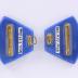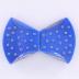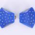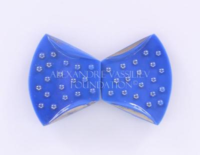 Art Deco design belt buckle in the shape of a bow, consisting of two parts connected with a brass hook clasp. The buckle is made of blue glass with relief dots and cut edges, painted in silver.