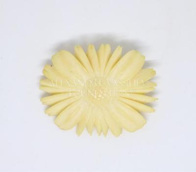 Daisy flower shape brooch in carved celluloid, imitating ivory.