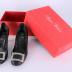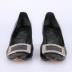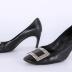 Pair of women's high heels, on a medium high slightly curved stiletto heel. The model name is "Belle Vivier". The shoes are in black leather with rounded toes and large rectangular silver metal buckles. The pair comes in its original red cardboard box.