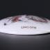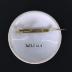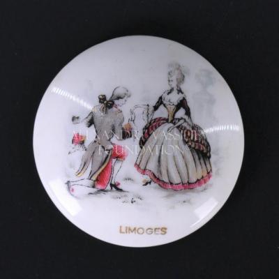 Round brooch in porcelain representing a scene with an 18th century dressed man kissing the hand of the same period dressed woman, with painted pink, black and gold details. The whole on the white background with brass pin on the back.
