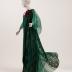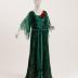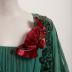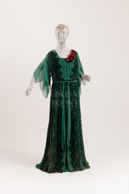 Green panne velvet long evening dress with a geometric Art Deco pattern and wing chiffon sleeves, the bodice is decorated with an artificial flower made of crimson velvet and pleated green chiffon plastron, plus a woven chiffon belt.