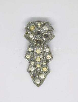 Dress clip in aluminum representing an Art Deco design decorated with rhinestones.