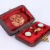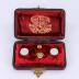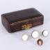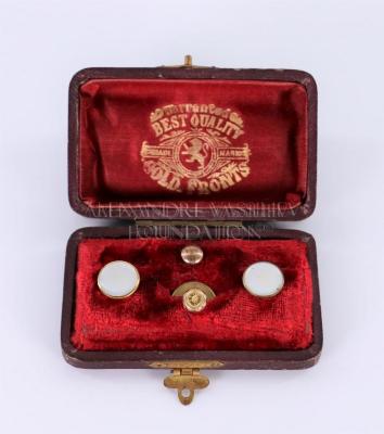 Two pairs of white moonstone cufflinks in their original packaging. The four pieces sit in a small, dark box lined with red velvet. A small golden clasp keeps the lid shut. Inside the box reads, "Warranted Best Quality Gold Fronts" with a lion in the center.
