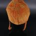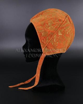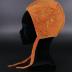 Velvet children's hat with strings attached to sides falling over the ear. The color is burnt orange with a mustard design throughout the outer layer. The inside is lined with an ivory colored fabric. The hat's cut follows the shape of the skull.