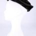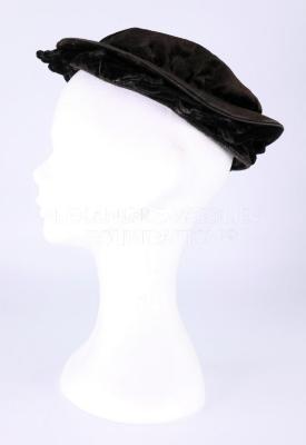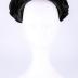Black velvet women's flat hat. The hat features velvet leaves on the brim that are positioned in a way that when viewed from underneath, they appear to be angled or turning towards the left side. The inside of the hat is lined with black silk.