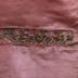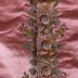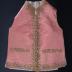 Men's vest with pink silk in the front and beige fabric in the back. It has green and yellow leafy foliage embroidery on the standing, down the middle near the opening and at the bottom of the front of the waistcoat. The pockets are two straight rectangles on each side and they have the same leafy embroidery. The buttons are covered with the same fabric as the front of the vest and there is a clover on each.