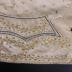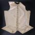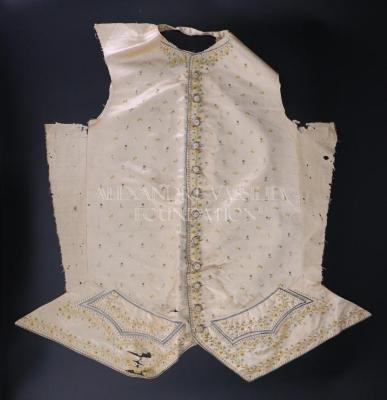 Front part of a men's waistcoat. Made with beige coloured silk with small flower embroidery spaced out over the gilet. The leaves are green and the petals are either blue, yellow or white. Each front has a pocket and pointed pocket flap. The edge of the pocket and around it, is embroidered with a light blue trimming. The same floral design is present in the pocket as well as around it following the shape of the pochet, which consist of the same flower in different colours all attached to the same stems. The same design and blue line is along the bottom of the waistcoat and it continues along the opening under the buttons . On the edge of the buttons there is a blue line and in its center the same flower found on the design in the color white. On each side there is linen fabric that would be part of the back which is missing.