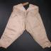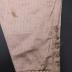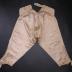 Beige breeches in silk. It has embroidered vertical lines are vertical on the legs and horizontal lines on the waistband. There are three buttons on the waistband in the middle, and one on each hip which are smaller. The cuffs are thicker than the pants and made of woollen fabric. They go over the pants to be tight up. The cuffs are embellished with pink and green floral embroidery.