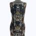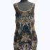 Mini dress with gold, silver and bronze sequins of different sizes and shapes arranged in geometric patterns which almost entirely cover the black background. All the borders of the dress have three rows of sequins in the shape of a cylinder. The inside is lined with black fabric. The U shape neckline dress has pockets on the sides and a zipper on the left side.