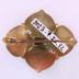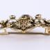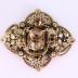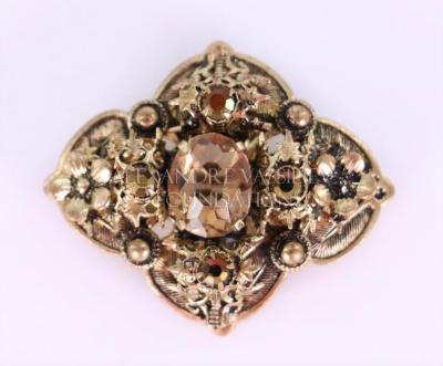 Lozenge shaped brooch with curvy extremities heavy in details. The center has a transparent citrine stone that appears slighlty orange. On each side are domed leafy detail mounted by a greensih stone. Next to two of them, are flowers. The base of the brooch ressemble leaves.