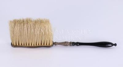 Clothes brush made of pig bristle with a silvered copper frame. It has a wooden handle covered with black lacquer to imitate ebony.