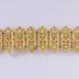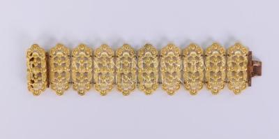 Bracelet made of connected slats of pinchbeck. The pieces are identical with ornate and embossed desgins. Most of the metal is engraved or has a portruding piece, like small golden balls.