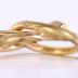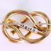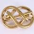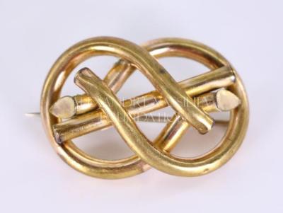 Brass brooch in the shape of a loop knot with a long thin cylinder in the middle.
