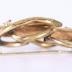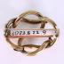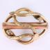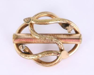 Brass brooch in the shape of a loop knot with vegetal ornament with a long thin cylinder in the centre.