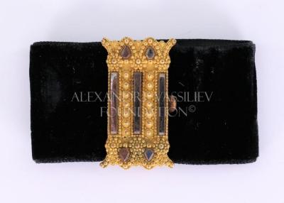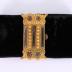 Women's bracelet in black velvet decorated with a large rectangular patterned buckle in pinchbeck, with brass on the reverse side, embellished with four small cut steel faceted stones drop shaped and three oblong plates. Fastens with a push in clasp.