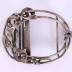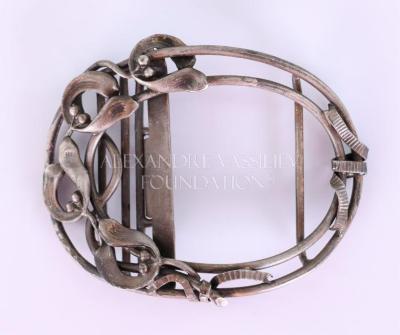 Large oval belt buckle in openwork silver metal, representing an art nouveau motif with mistletoe flowers.