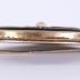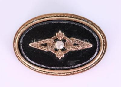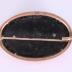 Black oval celluloid brooch in sivler frame decorated with silver ornament and white glass bead in the center.
