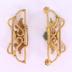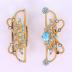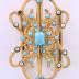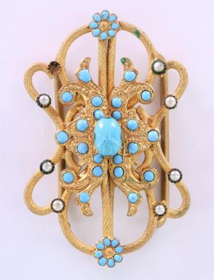 Art Nouveau style belt buckle consisting of two parts both in openwork brass forming vegetal design decorated with small turquoise and pearl beads and one big oval turquoise in the center.