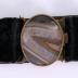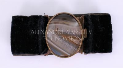 Women's bracelet in black velvet with a brass mounted buckle decorated with oval agate, with push in clasp.