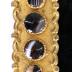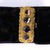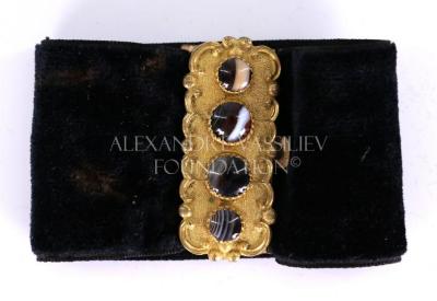 Women's bracelet in black velvet decorated with a rectangular patterned buckle in pinchbeck inlaid with four round agats. Reverse side in brass. Fastens with a push in clasp.