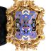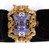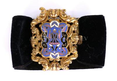 Women's bracelet in black velvet with a big buckle decorated with cloisonne enamel representing chinese character, surrounded by massive pinchbeck frame in baroque style.